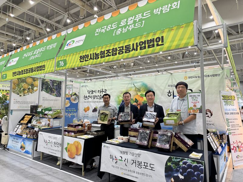 [천안시는 21일 ‘2025 전국 8도 로컬푸드 박람회’에 참가해 성환배, 입장포도 등을 선보이고 있다. ]