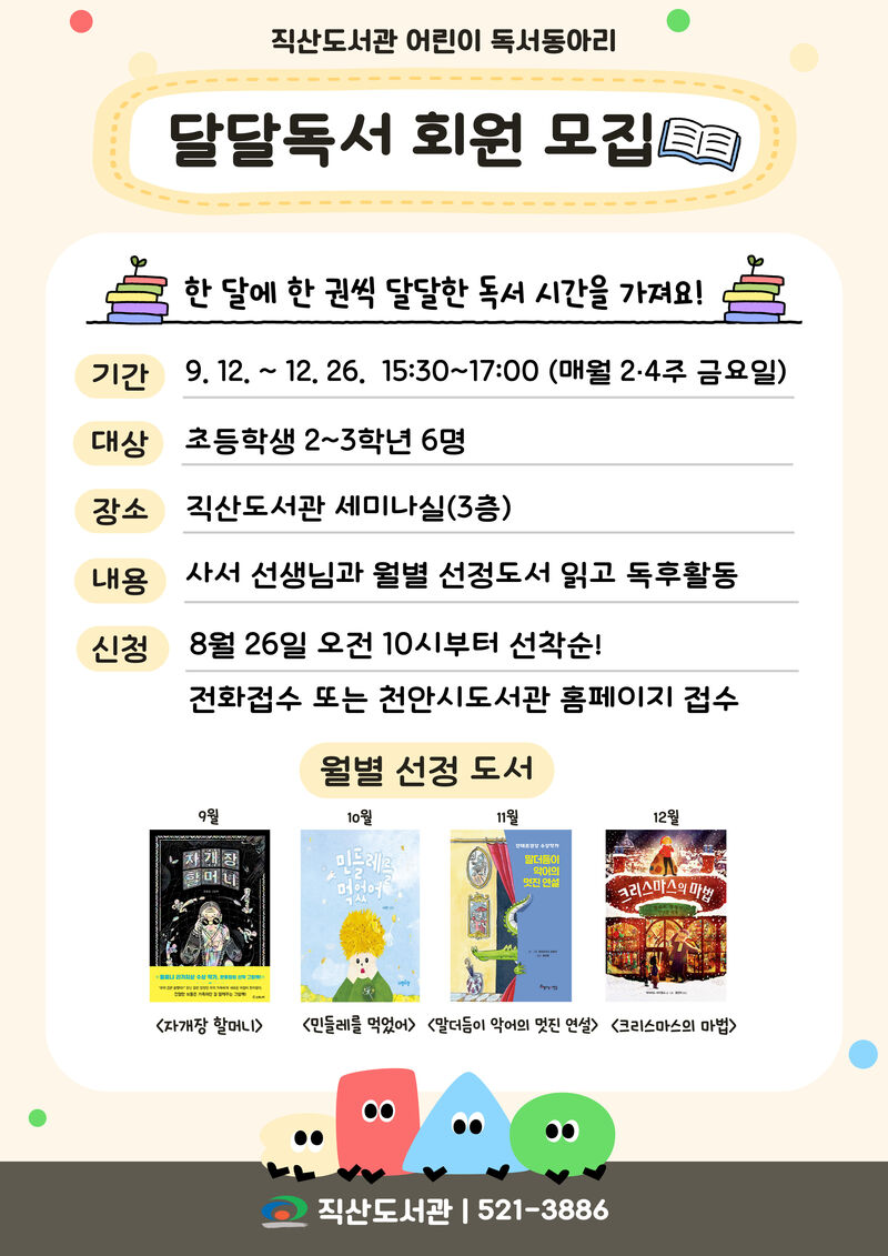 천안직산도서관(관장 이충미)은 오는 9월 12일~ 12월 26일 어린이 독서동아리 ‘달달독서’를 운영한다고 21일 밝혔다.