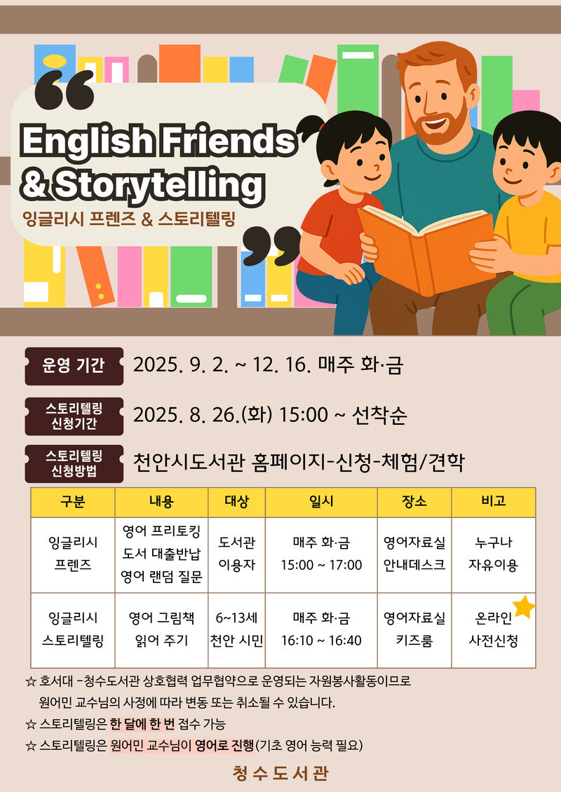 매주 화·금요일에는 호서대학교 원어민 교수진들의 재능기부 프로그램 ‘잉글리시 프렌즈’를 운영, 도서 대출 및 반납 시에 자유롭게 영어로 교류할 수 있다. 이와 함께 영어자료실 키즈룸에서 어린이들에게 영어 동화책을 읽어주는 ‘잉글리시 스토리텔링’도 함께 진행할 예정이다.
