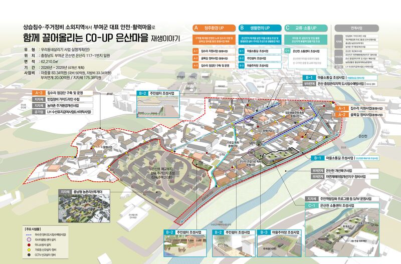 부여군은 국비 50억원과 지방비 33억 3400만원을 투입해 △은산천변 일대 특화가로 조성 △휴게공간 조성 △집수리 및 골목길 개선 △소통센터 조성 등 지역 맞춤형 도시재생을 본격 추진할 계획이다.