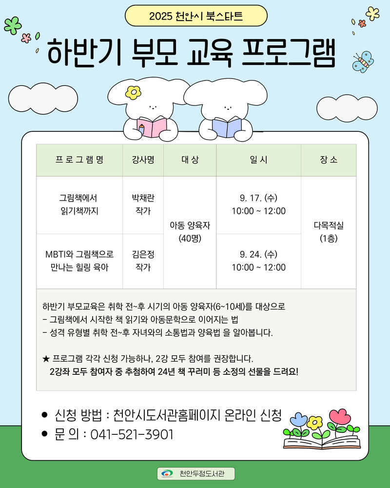 두정도서관 관계자는 “하반기 부모 교육 프로그램을 통해 양육자들의 독서지도와 양육 고민을 해소하고, 가정 내 독서 분위기를 함양하는 데 도움이 되기를 바란다”고 말했다.