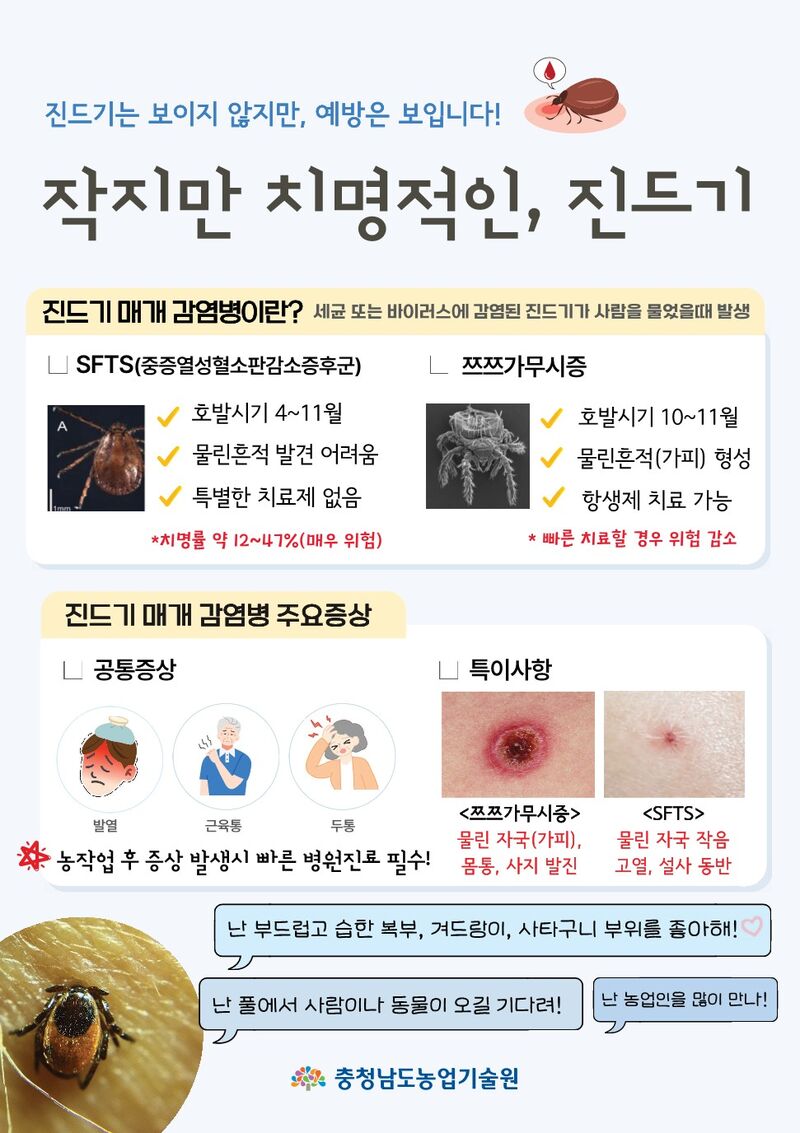 충남도 농업기술원은 가을철을 맞아 진드기 매개 감염병 예방수칙을 철저히 준수해 줄 것을 안내했다.