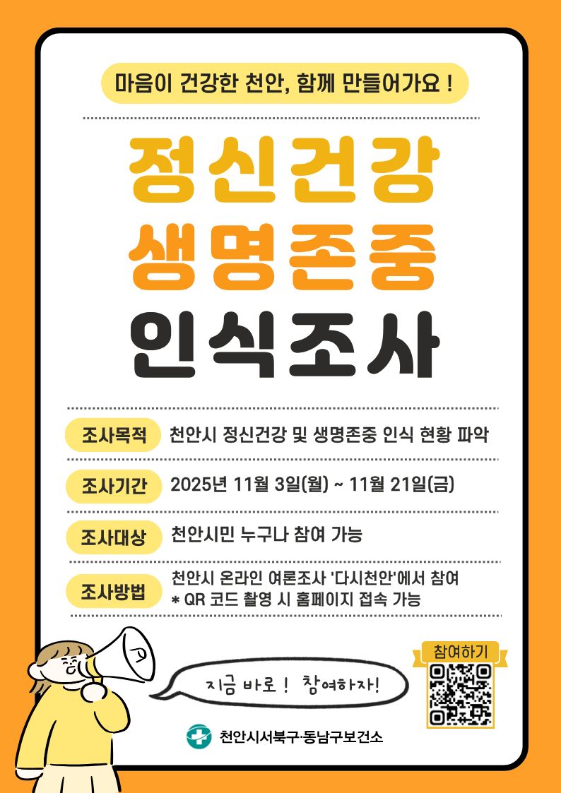 천안시, 정신건강·생명존중 인식조사 실시 - 내달 3~21일 천안시 여론조사‘다시 천안’통해 참여 가능
