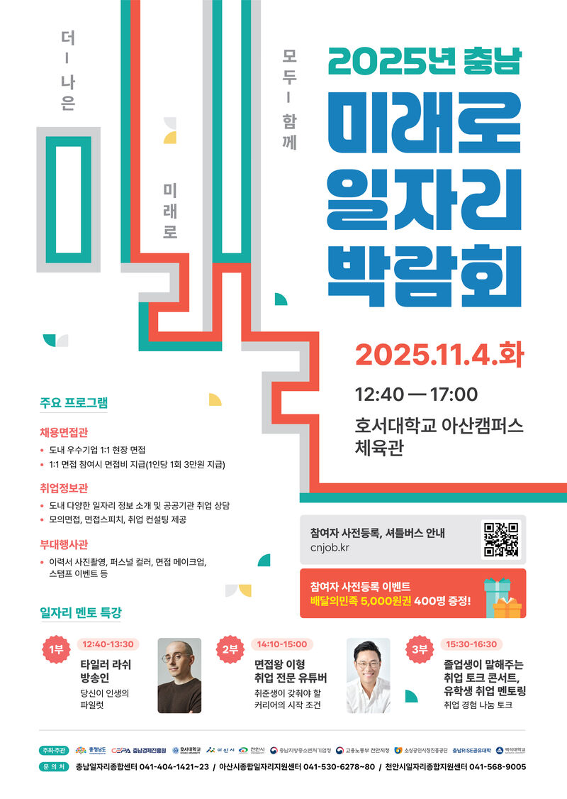 취업정보관에선 도내 공공기관과 대학 등 민간기관이 함께해 일자리 관련 지원 정책을 안내하며, 이벤트관에선 △자기소개서 컨설팅 △이력서 사진 촬영 △퍼스널 컬러 진단 및 면접 메이크업 등을 진행한다.