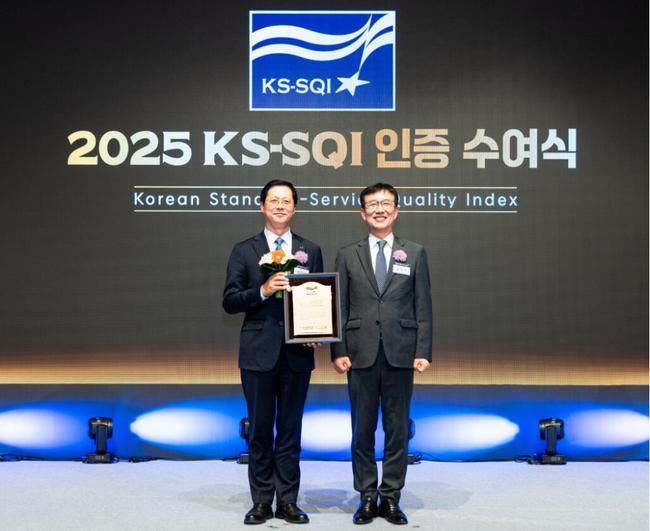 `2025 KS-SQI` 인증 수여식에 참석한 박희돈 대한항공 경영전략본부장(왼쪽)이 문동민 한국표준협회 회장과 기념 사진을 촬영하는 모습