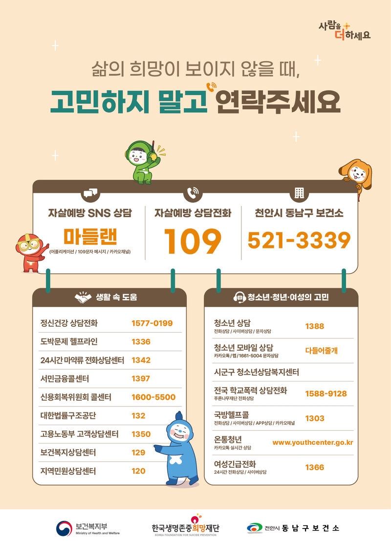 한편 삶에 희망이 보이지 않을 때는 고민하지 말고 24시 자살예방 상담전화(109), 천안시 동남구 자살예방센터(041-521-3339), 서북구 자살예방센터(401-578-9709)로 연락하면 전문적인 상담과 도움을 받을 수 있다.