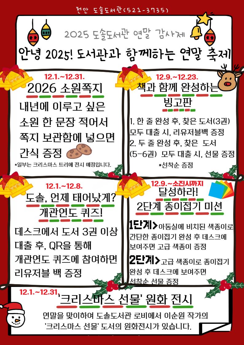 도솔도서관은 시민들에게 감사한 마음을 전하기 위해 ‘안녕 2025! 도서관과 함께하는 연말 축제’를 열고 다채로운 문화 프로그램을 선보인다.