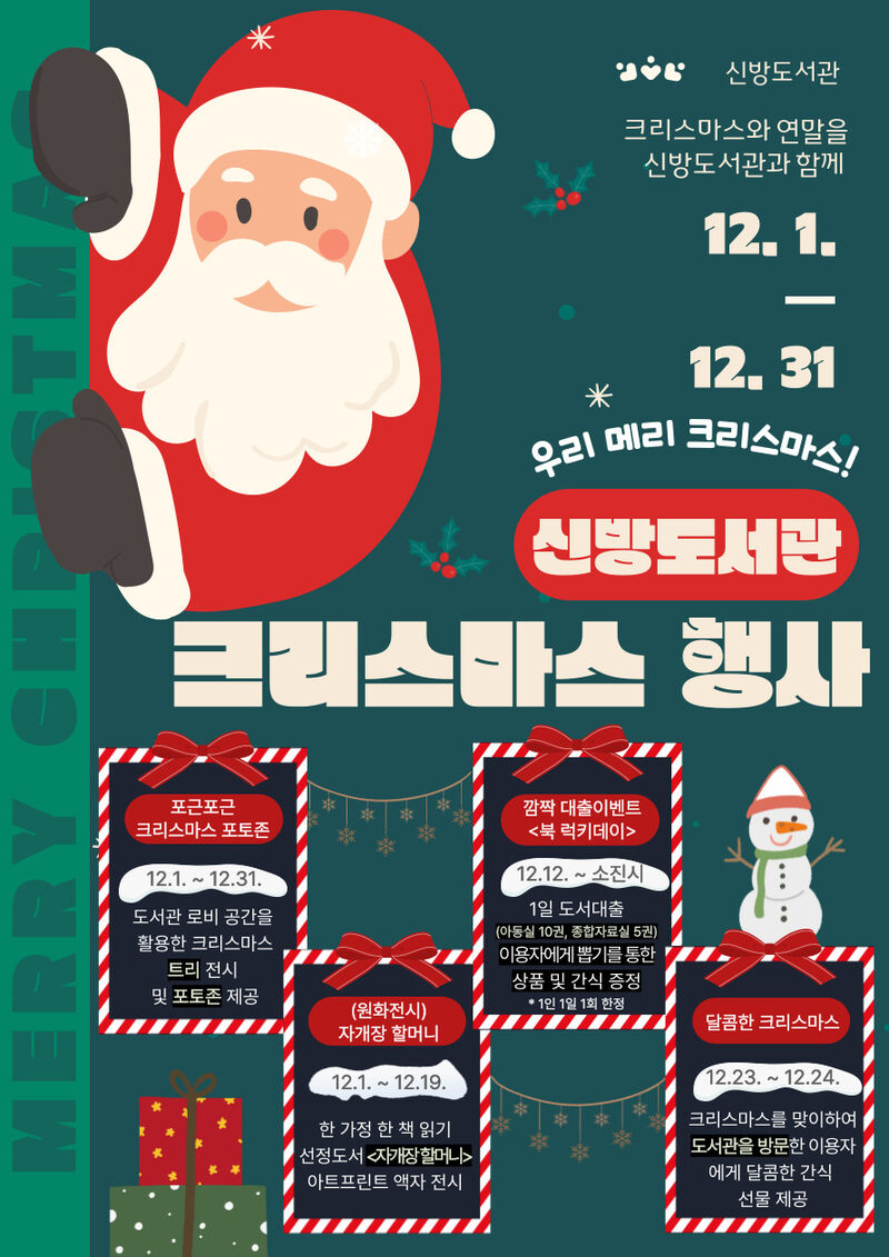 천안시 신방도서관은 12월 한 달 동안 연말 맞이 크리스마스 행사를 운영한다고 3일 밝혔다.