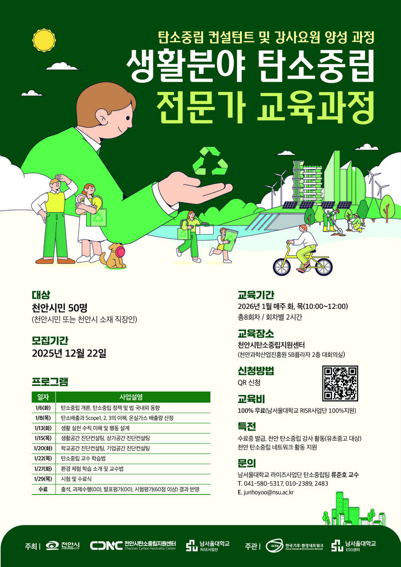 천안시 탄소중립지원센터는 내년 1월 6~ 29일 천안SB플라자에서 ‘생활분야 탄소중립 전문가 교육과정’을 운영한다고 9일 밝혔다.