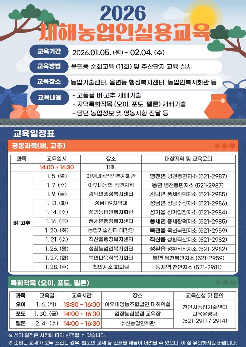 천안시농업기술센터는 내년 1월 5일부터 2월 4일까지 ‘새해농업인실용교육’을 추진한다고 26일 밝혔다.