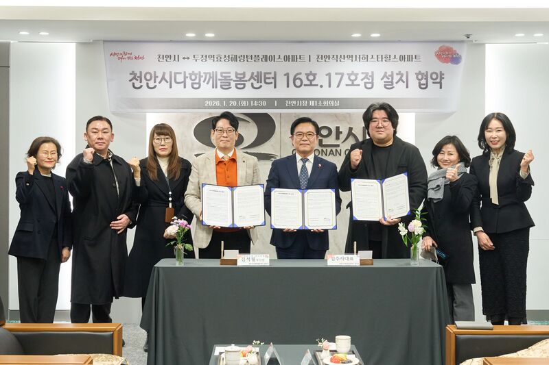 천안시, 다함께돌봄센터 16·17호점 설치 협약…돌봄 공백 해소 - 두정역 효성·직산역 서희아파트와 무상임대 협약…2036년까지 10년 제공