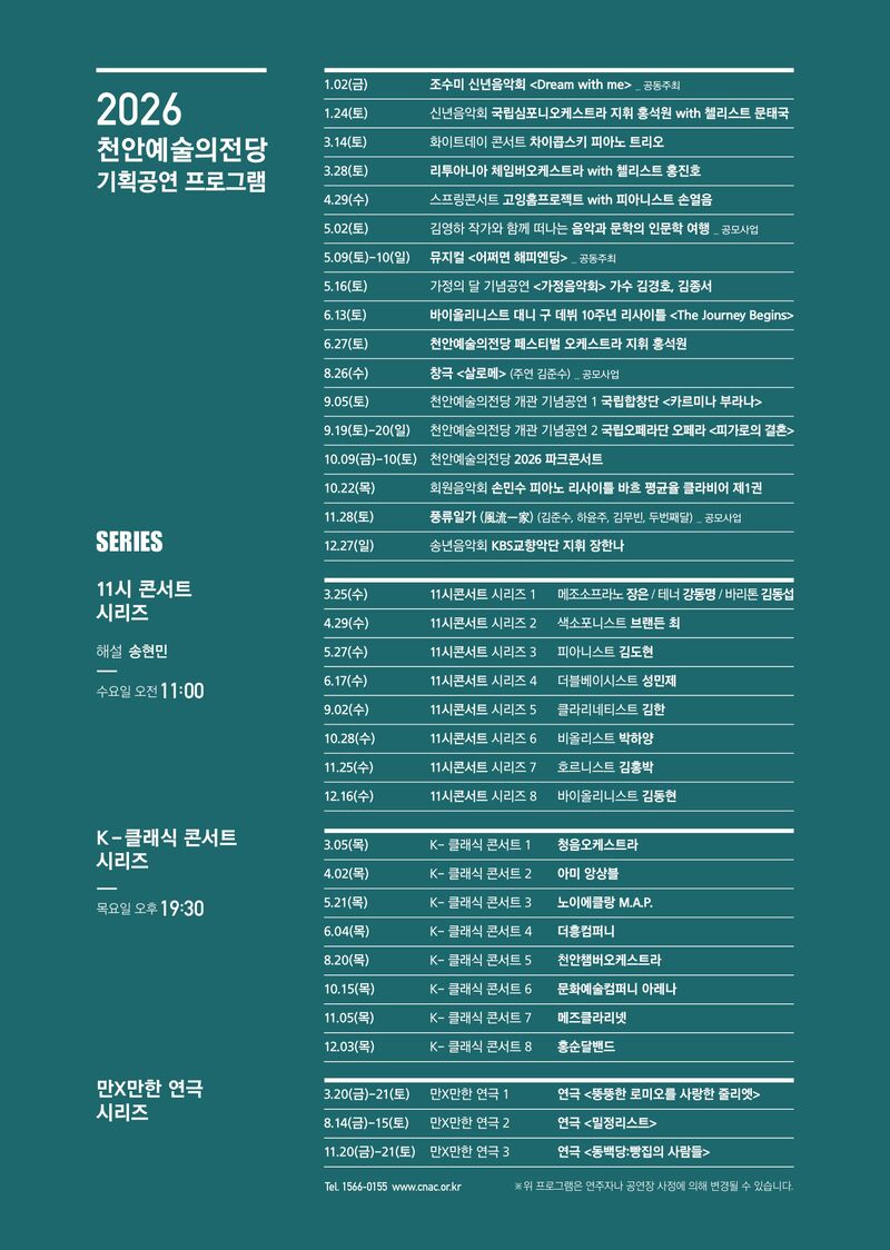 2026년 시즌의 시작은 최근 열린 천안예술의전당 신년음악회에서 국립심포니오케스트라와 홍석원 지휘 아래 첼리스트 문태국이 웅장한 무대로 알렸으며, 이후 △3월, 화이트데이 콘서트 ‘차이콥스키 피아노 트리오’·리투아니아 체임버오케스트라 with 첼리스트 홍진호 △4월, 스프링콘서트 ‘고잉홈프로젝트 with 피아니스트 손열음’ △5월, 뮤지컬 ‘어쩌면 해피엔딩’ △6월, 바이올리니스트 대니 구 데뷔 10주년 리사이틀 ‘The Journey Begins’·천안예술의전당 페스티벌 오케스트라 with 지휘 홍석원이 이어진다.