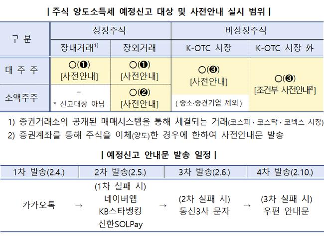 국세청은 증권사 자료를 활용해 예정신고 대상 여부와 신고 방법을 안내한다. 안내문은 2월 4일부터 카카오톡 등 모바일 알림으로 순차 발송되며, 수신 실패자와 60세 이상 대상자에게는 2월 10일 우편 안내문이 추가 발송된다. 상장주식 대주주와 장외거래 소액주주, 비상장주식 양도자는 사전안내 대상에 포함된다.