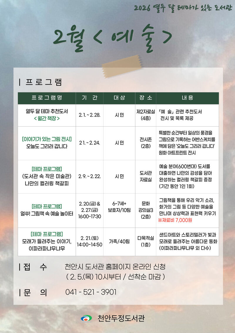 천안시 두정도서관이 2월 한 달간 ‘예술’을 테마로 도서관을 운영한다고 3일 밝혔다.