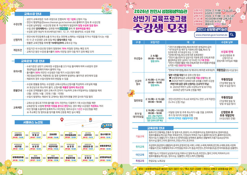 상반기 교육과 관련한 자세한 사항은 천안시 평생학습포털 누리집을 확인하거나 성정평생학습관(041-521-3811~2)으로 문의하면 된다.