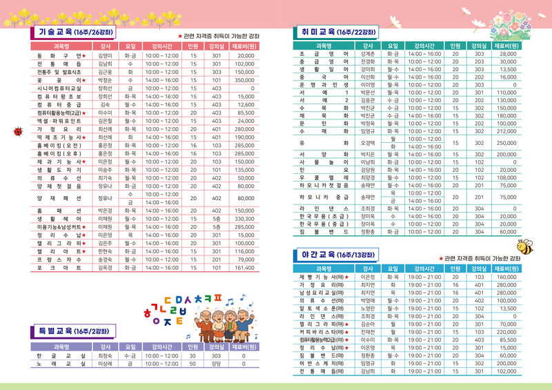 상반기 교육은 총 63개 강좌에서 1,139명을 모집한다. 교육 과정은 △기술교육 26강좌 △취미교육 22강좌 △야간교육 13강좌 △특별교육 2강좌로 구성됐으며, 오는 3월 9일부터 6월 26일까지 16주간 운영된다.