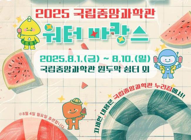 과학과 물놀이를 한자리에서… 국립중앙과학관, ‘과캉스’ 열린다 - 여름방학 맞아 ‘수박밭 수영장’·‘오싹한 인류관’ 등 특별행사 8월 1일부터 개최 - 타란툴라 특별전, 고양이·강아지 과학 학술대회 등 이색 프로그램도 다채 - 80주년 맞은 국립중앙과학관 “시원하고 과학적인 여름휴가 선사할 것”