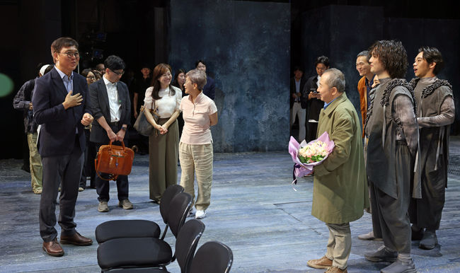 최휘영 문화체육관광부 장관이 3일 서울 중구 명동예술극장을 방문해 (재)국립극단의 `삼매경` 종연 공연을 관람한 뒤 출연진을 격려하고 있다.