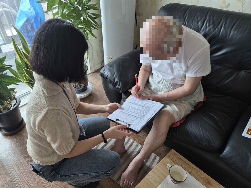 [천안시 공무원이 요양병원, 경로당 등을 방문해 민생회복 소비쿠폰 ‘찾아가는 신청’ 서비스를 받고 있다.]