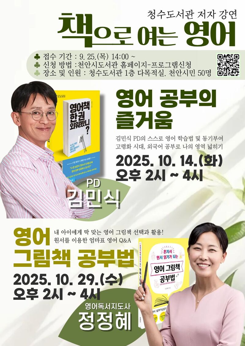 천안청수도서관은 오는 10월 ‘책으로 여는 영어’ 강연을 운영한다고 밝혔다.