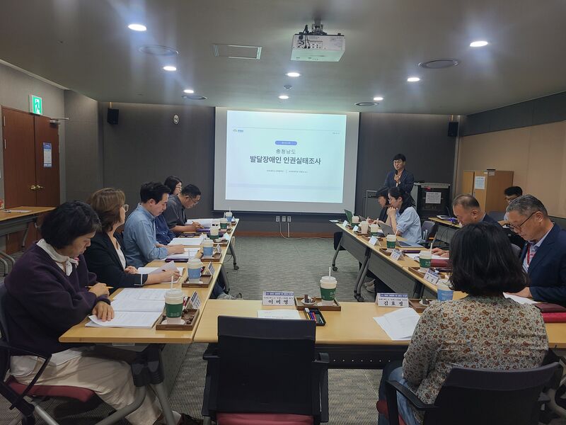 도 인권센터는 25일 도청 문예회관 세미나실에서 자문위원, 수행기관, 도 관련부서 등 20여 명이 참석한 가운데, ‘충청남도 발달장애인 인권 실태조사 연구용역 중간보고회’를 개최했다.
