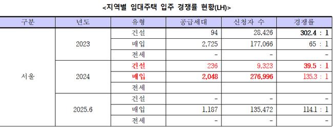 자료에 따르면 2024년 기준 서울의 매입임대 경쟁률은 135.3대 1, 건설임대는 39.5대 1에 달한다. 올해 상반기(6월)에도 매입임대 경쟁률은 114.1대 1로 여전히 포화 상태다. 특히 재건축 예정지인 강서구 가양동 영구임대아파트 인근의 경우 건설임대 입주율이 100%에 육박하고, 매입임대주택 역시 평균 경쟁률이 119대 1로 나타났다.