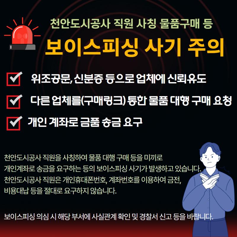 천안도시공사가 최근 공사 직원을 사칭한 보이스피싱 사례가 발생함에 따라 피해 예방을 위한 주의를 당부했다.