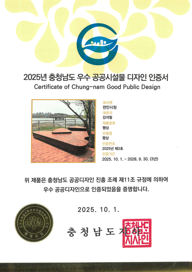 천안시는 ‘2025 제16회 충청남도 우수공공시설물 디자인 인증제’에서 평상 디자인으로 공공기관 최초 인증을 받았다고 22일 밝혔다.