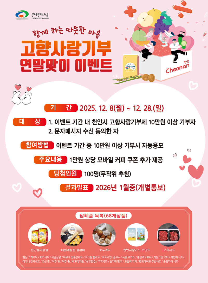 천안시는 오는 28일까지 ‘고향사랑기부제 연말맞이 이벤트’를 진행한다고 8일 밝혔다.