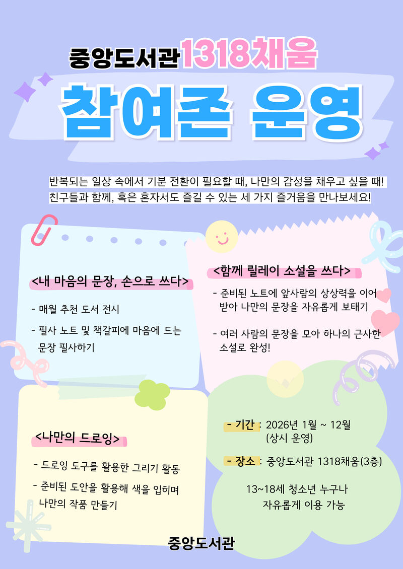 참여존에서는 ▲내 마음의 문장, 손으로 쓰다 ▲함께, 릴레이 소설을 쓰다 ▲나만의 드로잉 코너가 마련돼 청소년들의 자율적인 활동을 지원한다.