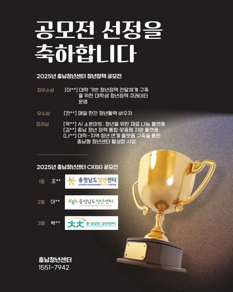 충청남도청년센터 관계자는 “이번 공모전은 청년들의 창의적인 시각을 통해 센터의 정체성을 재정립하는 뜻깊은 계기였다”며, “앞으로도 청년이 직접 참여하고 만들어가는 다양한 정책·사업을 지속적으로 추진하겠다”고 밝혔다.