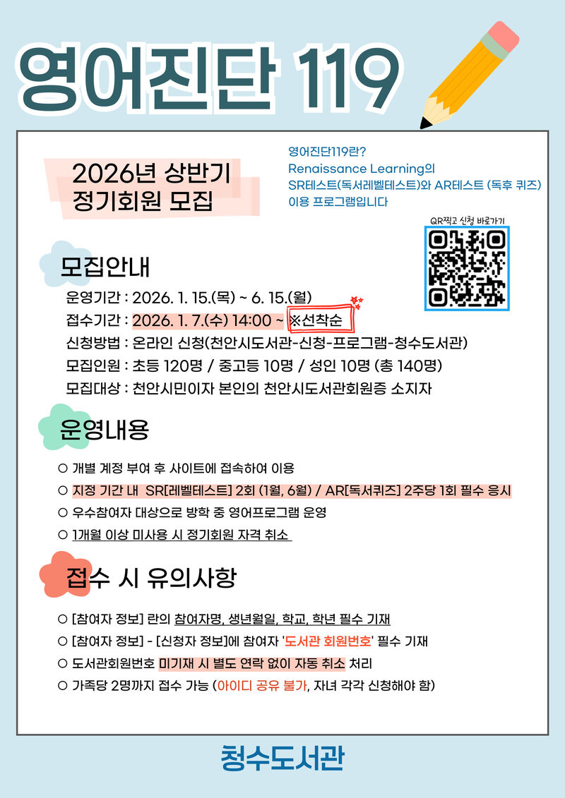 상반기 정기회원 신청은 오는 7일 오후 2시부터 천안시도서관 누리집을 통해 가능하며, 자세한 사항은 청수도서관 영어자료실(041-521-3933)로 문의하면 된다.
