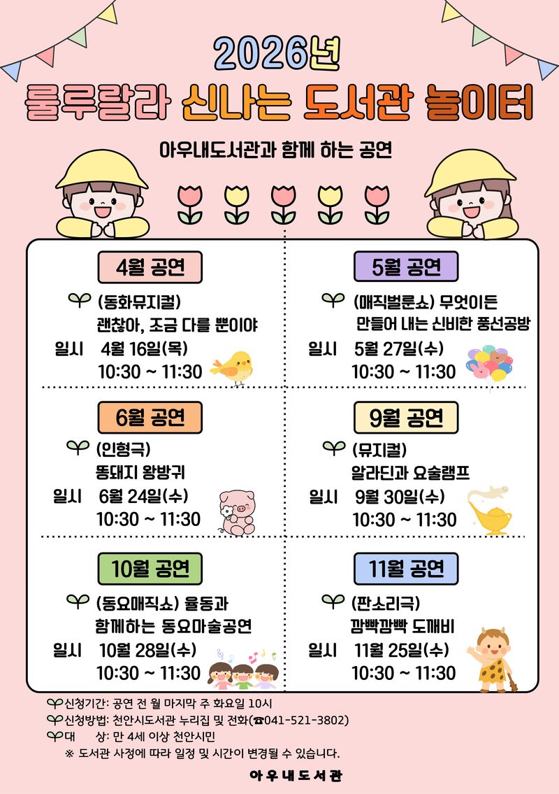 참여 신청은 공연 전월 마지막주 화요일 오전 10시부터 전화 등으로 가능하며, 자세한 사항은 천안시도서관 누리집에서 확인할 수 있다.