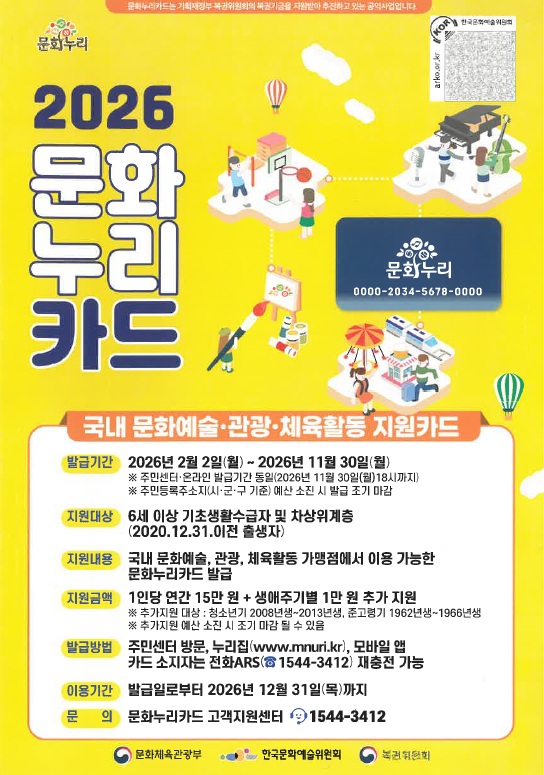 특히 청소년기(13~18세)와 준고령기(60~64세) 대상자는 연간 16만 원까지 지원받을 수 있다. 신청은 2월 2일부터 읍면동 행정복지센터 방문 또는 문화누리 누리집(www.mnuri.kr)을 통해 가능하다.