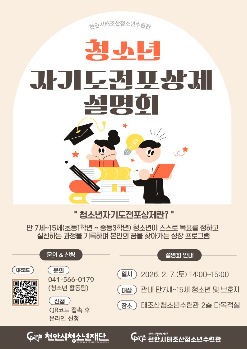 (재)천안시청소년재단 천안시태조산청소년수련관은 오는 7일 수련관 다목적실에서 ‘청소년자기도전포상제’ 설명회를 개최한다고 2일 밝혔다.